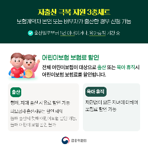 - 어린이보험료 할인: 출산 또는 육아휴직 시 자녀의 보험료를 약 3~10% 할인해 줍니다.