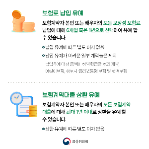 - 대출 상환 유예: 보험계약대출이 있다면 최대 1년까지 원금과 이자 상환을 미룰 수 있습니다.